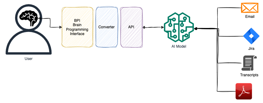 In this thought experiment, a Brain Programming Interface would sit between our neural activity and the model. Imagine electrodes, or perhaps some future non-invasive sensors, continuously reading the firing patterns of neurons. A converter layer would translate those signals into embeddings or structured representations, while an API gateway would pass them directly into an AI model. The loop could even work in both directions: not only retrieving information from the “brain context” but feeding enriched outputs back, perhaps as visual overlays, auditory signals, or even as direct neural stimulation.