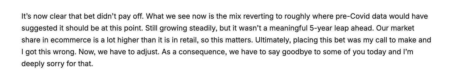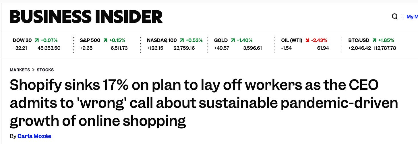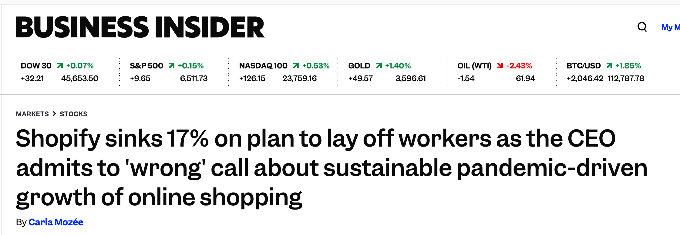 Leaders assumed that surge would stick. In Shopify’s 2022 letter, the CEO wrote that they bet e-commerce had leapt 5–10 years ahead—and got it wrong. Hiring and spend were built for a world that never fully materialised, and layoffs followed.