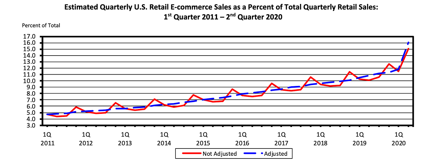 When lockdowns hit in 2020, online demand spiked and many tech companies hired at breakneck speed. U.S. Census data shows e-commerce sales jumped 43% in 2020 (≈+$244B vs. 2019). In Q2-2020, e-commerce briefly reached ~16% of U.S. retail—a clear step-change from the prior trend.