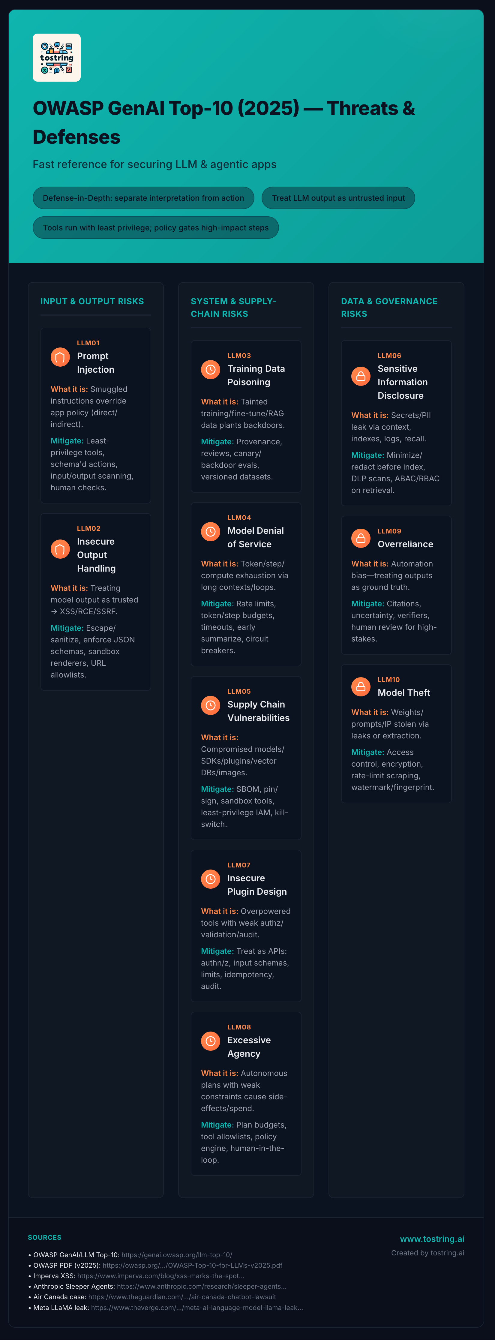 Compromise via your dependencies: models, SDKs, plugins/tools, vector DBs, container images. OWASP highlights this as a primary LLM risk.
