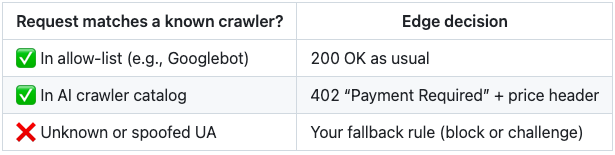 · If crawler UA not on allow-list → serve max 10 KB, then 402.